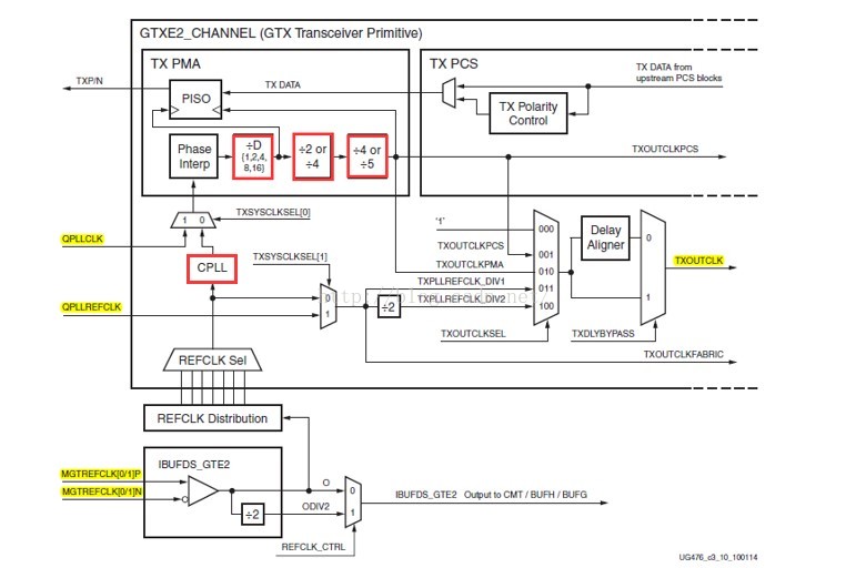 其中红框部分和黄底部分的内容是我们需要重点了解的地方,图中的MGTREFCLK是上一篇中提到的GTX的参考时钟,经过一个IBUFDS_GTE2源语之后进入GTX,用以驱动CPLL或者QPLL。对于TX PMA来说,主要实现的功能是并串转换,其并串转换的时钟可以由CPLL提供,也可以由QPLL提供,由TXSYSCLKSEL选择,TX PMA子层里面有三个红色方框部分是串行和并行时钟分频器,作用是产生并行数据的驱动时钟,其中D分频器主要用于将PLL的输出分频,以支持更低的线速率。