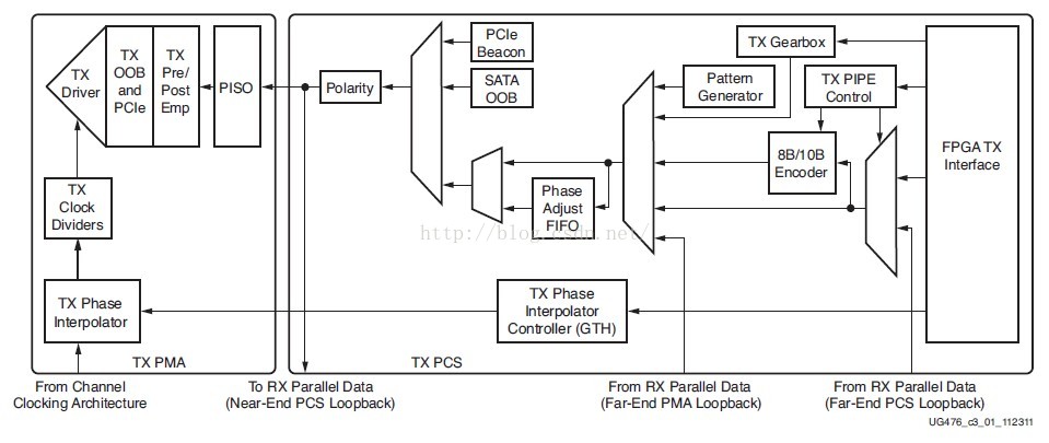 FPGA内部并行数据通过FPGATX Interface进入TX发送端,然后经过PCS和PMA子层的各个功能电路处理之后,最终从TX驱动器中以高速串行数据输出,下面将介绍各个功能电路。