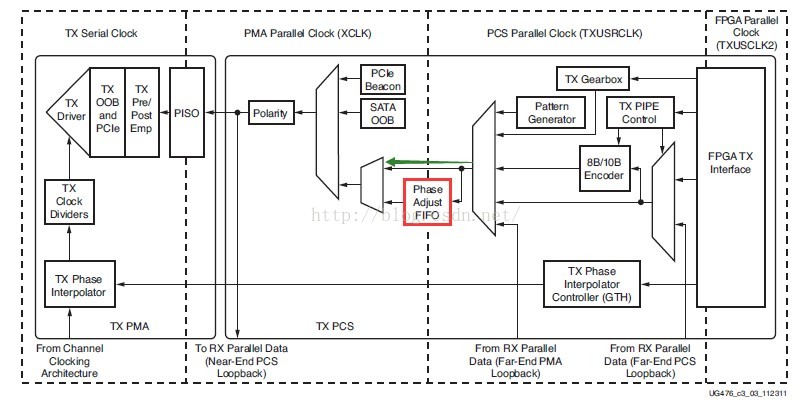 TX Buffer也可以被旁路,TX发送端提供了一个相位对齐电路,可以解决XCLK和TXUSRCLK时钟域之间的相位差,但是TX_XCLK_SEL需设置为“TXUSR”来保持XCLK时钟域和TXUSRCLK保持同频。