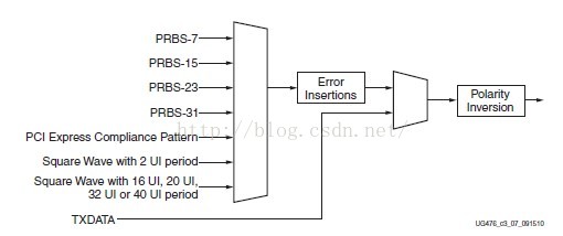TX Pattern Generator:GTX拥有伪随机数列产生电路,伪随机数列是之中看似随机,但是是有规律的周期性二进制数列,有良好的随机性和接近白噪声的相关函数,所以伪随机数列可以用来做误码率测量、时延测量、噪声发生器、通信加密和扩频通信等等领域,在GTX中可以用来测试高速串行通道传输的误码率,图6是GTX的PRBS生成电路。