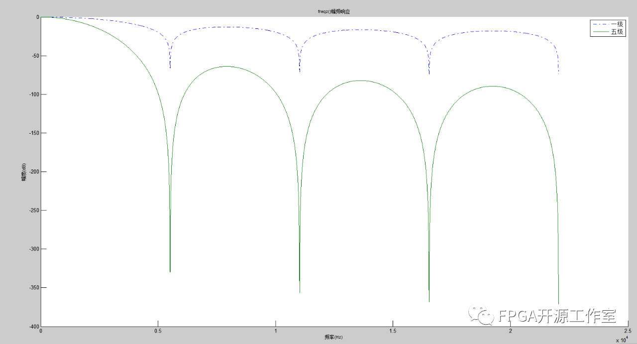 如图5所示,5个积分梳状滤波器级联的幅频响应如图6所示。