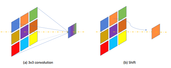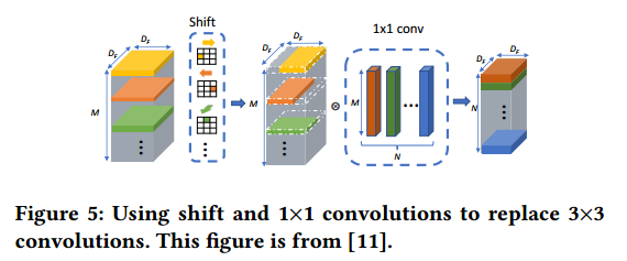 1) 将所有3x3卷积(包括3x3depth-wise卷积)都替换为shift和1x1卷积。这样替换是能够降低feature map数据的迁移,比如3x3的卷积每个图像数据要使用3次,而1x1只需要搬移一次,降低了逻辑复杂性,也提高了运算速度。Shift操作是将某个范围的pixel移动到中间作为结果,这样的操作减少了乘法运算次数。这种替换会导致精度降低,但是可以减少FPGA运算次数。