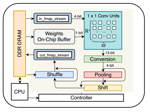 很久没有看基于FPGA的神经网络实现的文章了,因为神经网络加速设计做的久了就会发现,其实架构都差不多。大家都主要集中于去提高以下几种性能:FPGA算力,网络精度,网络模型大小。FPGA架构也差不多这几个模块:片上缓存,卷积加速模块,pool模块,load,save,指令控制模块。硬件架构上并不是太难,难的反而是软件编译这块。因为其要去适应不同的网络模型,还要能兼容FPGA硬件的变化,同时要为客户提供一个容易操作的接口。这些在目前情景下还比较困难。首先是FPGA硬件的变化太多,各个模块可配参数的变化(比如卷积模块并行数的变化),另外一个是网络模型多种多样以及开源的网络模型平台也很多(tensorflow,pytorch等)。网络压缩也有很多种算法,这些算法基本上都会导致网络模型精度的降低。一般基于FPGA的网络加速设计都会强调模型被压缩了多少以及FPGA上可以跑得多快,却很少集中于去改善精度。