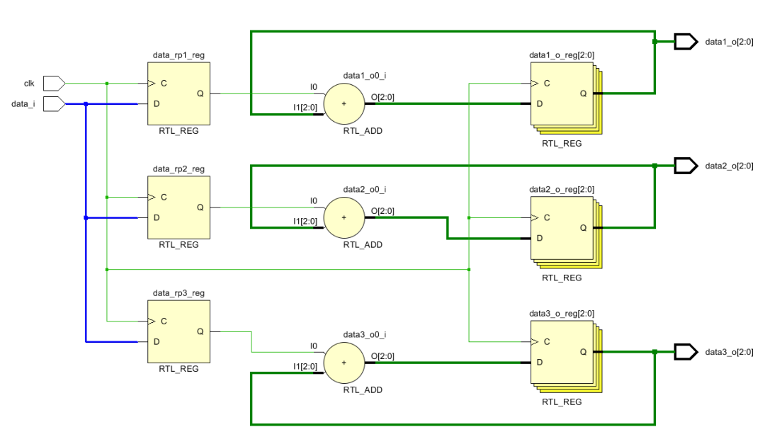 扇出是指某个信号驱动的信号的数量。驱动的信号越多,那么要求其产生的电流越大。学过数字电路就会知道,当一个信号输出连接的越多的时候,其输出负载就会越小,那么输出电压就会减小。所以如果信号扇出过大就会影响到高低电平,最终就会导致时序不收敛。另外一个原因是如果信号扇出过大,那么由于FPGA上走线路径的差异,就可能造成这个信号到达不同地址的延迟不同,造成时序不同步。一种解决办法是复制,将扇出较大的信号复制几份,这样就可以减小扇出。比如一个输入d_i需要和3个数进行求和。那么这个信号扇出就是3.如果将其复制3份,给每个数输送一份,那么扇出就变为1。