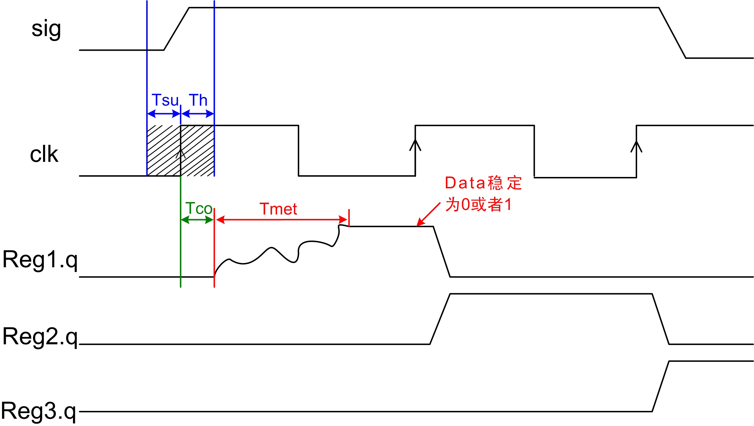 (1)在跨时钟域信号传输时,由于源寄存器时钟和目的寄存器时钟相移未知,所以源寄存器数据发出数据,数据可能在任何时间到达异步时钟域的目的寄存器,所以无法保证满足目的寄存器Tsu和Th的要求;