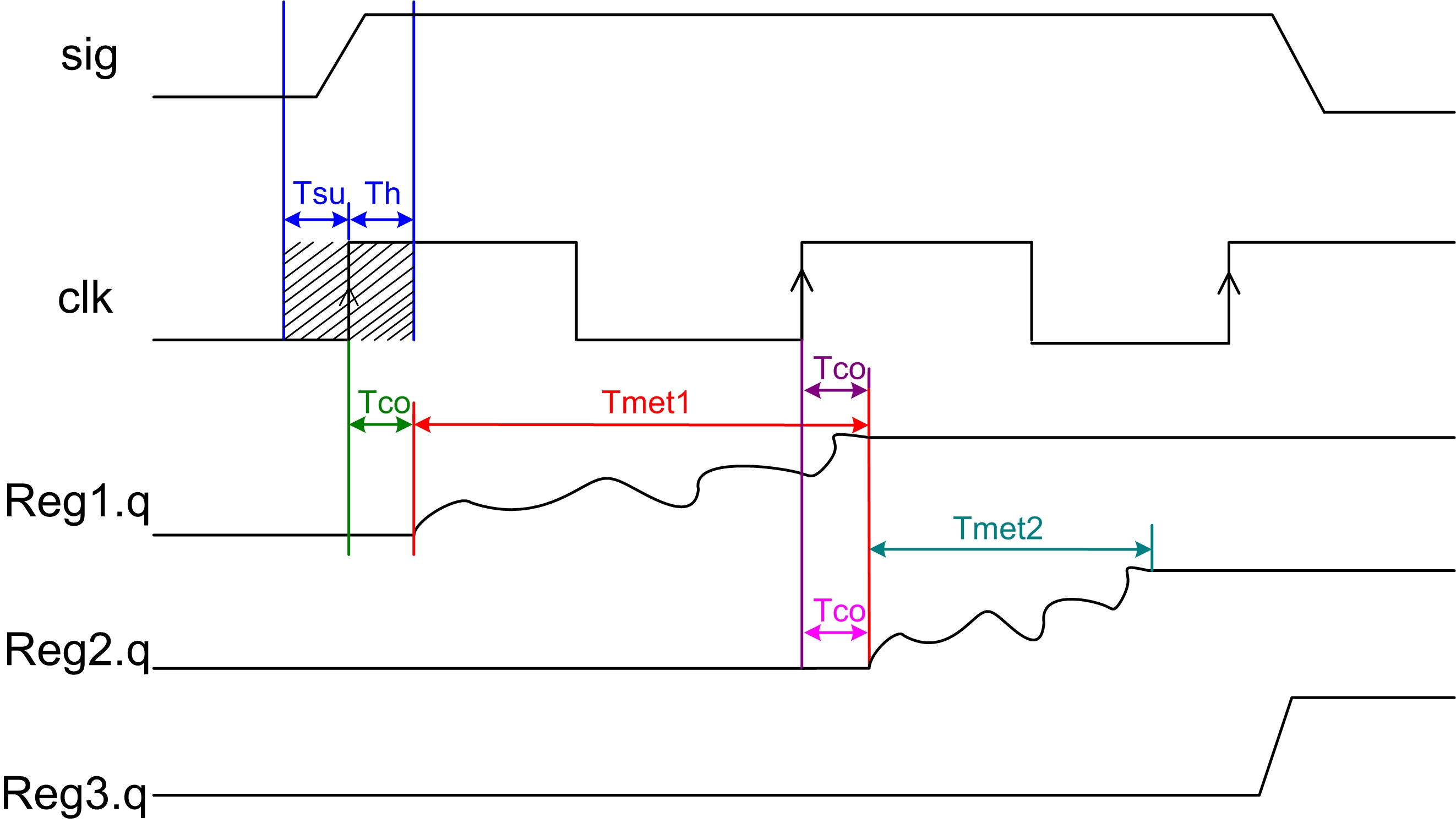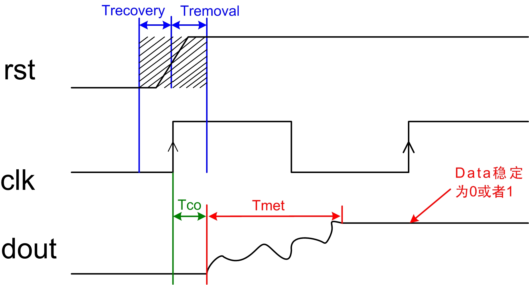 由图可知,当产生亚稳态后Tco时间后会有Tmet(决断时间)的振荡时间段,当振荡结束回到稳定状态时为“0”或者“1”,这个是随机的。因此,会对后续电路判断造成影响。