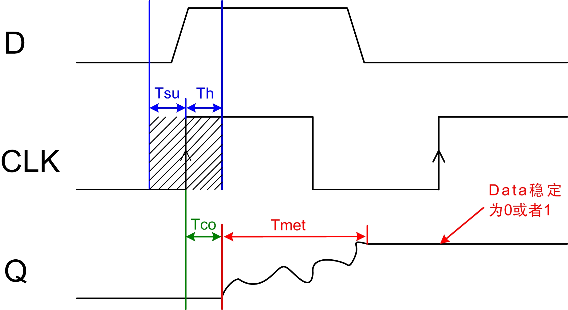 当数据在目的寄存器Tsu-Th时间窗口发生变化,也即当数据的建立时间或者保持时间不满足时,就可能发生亚稳态现象。如图3.1所示。