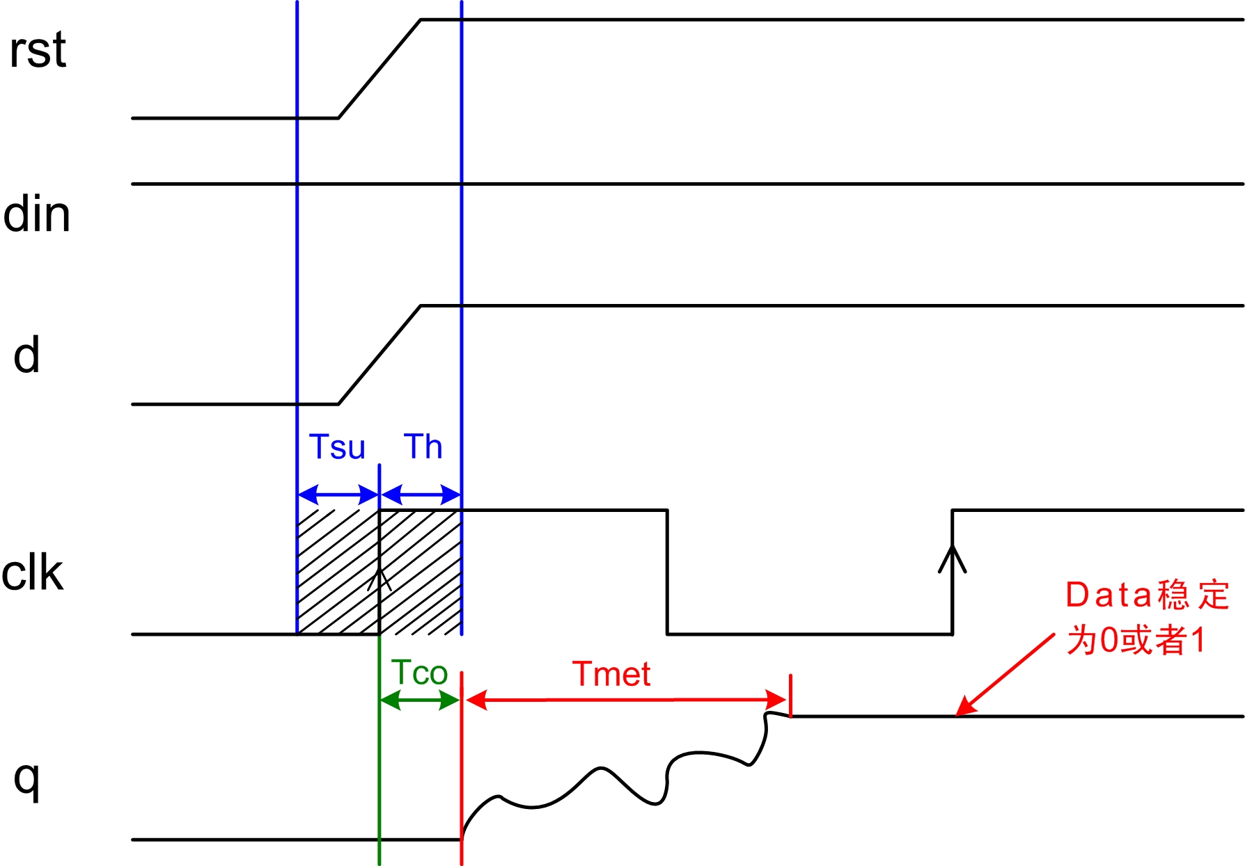 当输入端Din为高电平,而且复位信号的撤销时间在clk的Tsu和Th内时候,亚稳态就随之产生了。如图3.5时序所示,当复位撤销时间在clk的Tsu和Th内,输入数据为“1”,通过和输入数据相与后的数据也在clk的Tsu和Th内,因此,势必会造成类似异步信号采集的亚稳态情况。