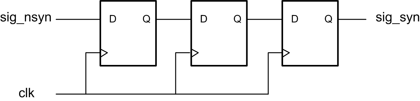 使用异步信号进行使用的时候,好的设计都会对异步信号进行同步处理,同步一般采用多级D触发器级联处理,如图3.6所示,采用三级D触发器对异步信号进行同步处理。