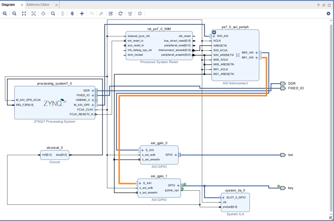 工程搭建很简单,就是配置完zynq核的外设后,增加一个axi_gpio模块,作为外部按键的接口。虽然按键并不是直接连接到arm的IO上,但是axi_gpio也被映射到zynq系统的内存空间中,linux驱动通过读写key对应的映射内存来控制和检测。要检测到key被按下我们必须开启中断,因此axi_gpio模块设置如下图。Address editor是gpio的对应的内存空间。Zynq已经为不同外设类型分配了可选的内存映射,通常工程建立完后,由软件工具自行分配就好了。如果一些外设内存有冲突,是无法生成hdf的。