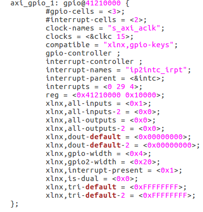 我们改了compitable的内容,同时要关注inerrupts,xlnx,all-inputs,xlnx,gpio-width这些属性。Gpio-width是宽度,all-inputs是表示为输入。