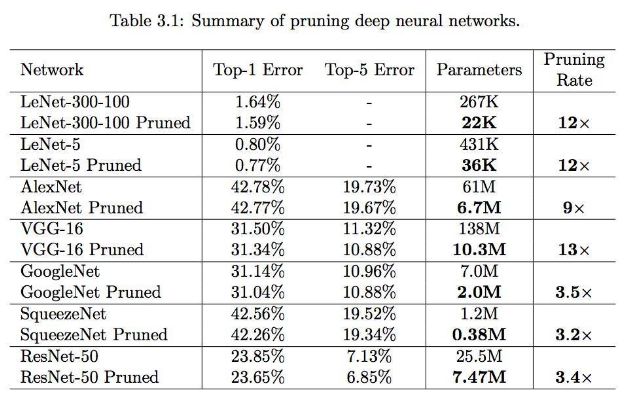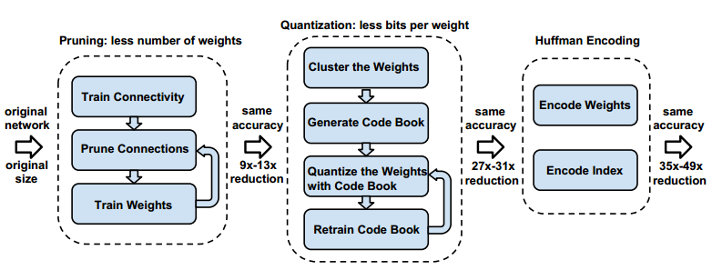 这篇论文来自文章也帮助深鉴科技在国内外获得了一定知名度。深度压缩首先通过剪枝减少了网络的连接,然后通过比特量化来降低权重量,最后通过无损压缩方式霍夫曼编码来缩小存储空间。作者分别对AlexNet和VGG-16进行了实验,获得了35倍和49倍的压缩量,而且精度几乎没有损失。