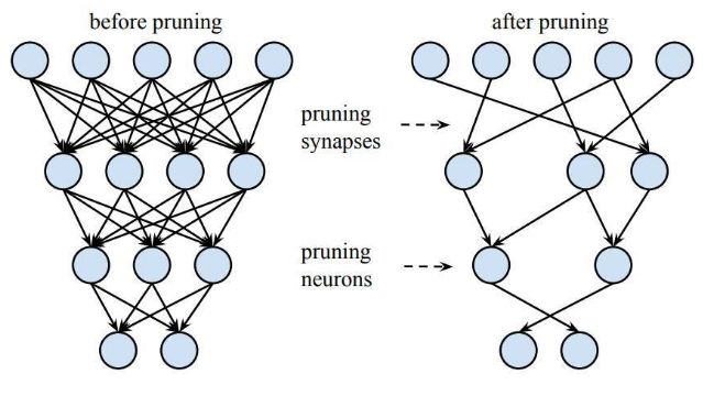 首先进行剪枝操作,也是很传统的方法,就是通过一定策略来过滤掉一些不重要的神经网络连接。然后再重新训练进行参数微调,不断重复这个过程直到不能够再进行剪枝为止。剪枝后的神经网络连接大大减少,剩下的都是对网络分类有最重要贡献的连接。其他被剪掉的连接的参数很小,产生的数值对结果影响可以通过重新训练来微调其他参数而弥补。在imageNet数据集上,剪枝方法可以将AlexNet的参数数量减少9倍而没有精度上的损失。VGG-16同样有类似的现象,参数总量可以减少13倍左右而没有精度损失。