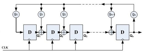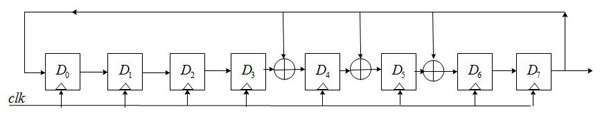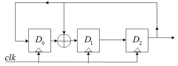 产生伪随机数的方法最常见的是利用一种线性反馈移位寄存器(LFSR),它是由n个D触发器和若干个异或门组成的,如下图: