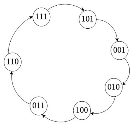 其中,gn为反馈系数,取值只能为0或1,取为0时表明不存在该反馈之路,取为1时表明存在该反馈之路;n个D触发器最多可以提供2^n-1个状态(不包括全0的状态),为了保证这些状态没有重复,gn的选择必须满足一定的条件。下面以n=3,g0=1,g1=1,g2=0,g3=1为例,说明LFSR的特性,具有该参数的LFSR结构如下图: