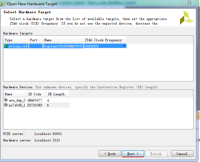 先打开Vivado,将板卡用JTAG线连接到电脑并打开open target: