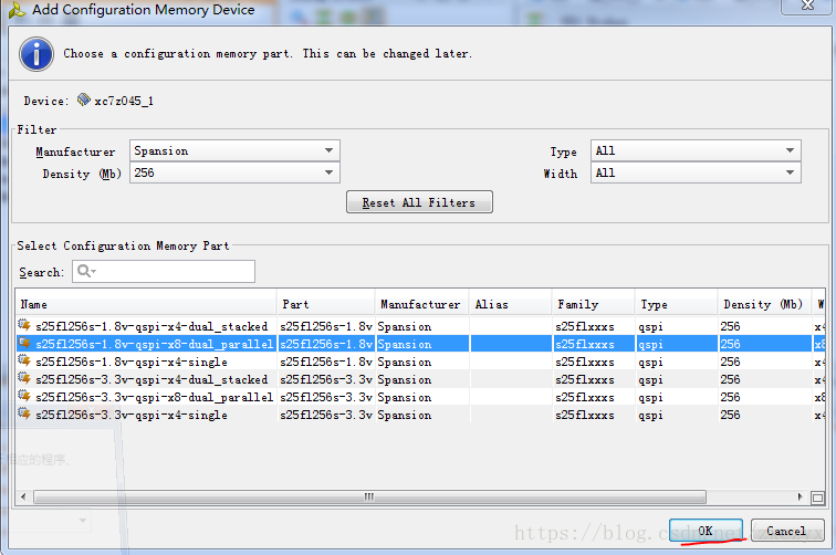 选中后右键单击Add Configuration Memory Device进入以下界面,并选择自己板卡的Flash型号。