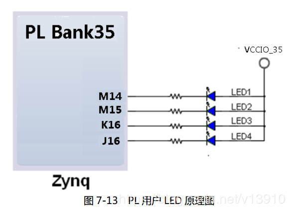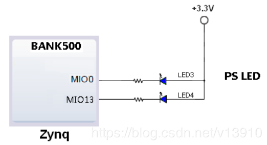 从电路中看得很清楚,这两个LED直接连接在MIO0和MIO13上,所以直接在这两个端口输出高低电平就可以控制灯闪烁了。
