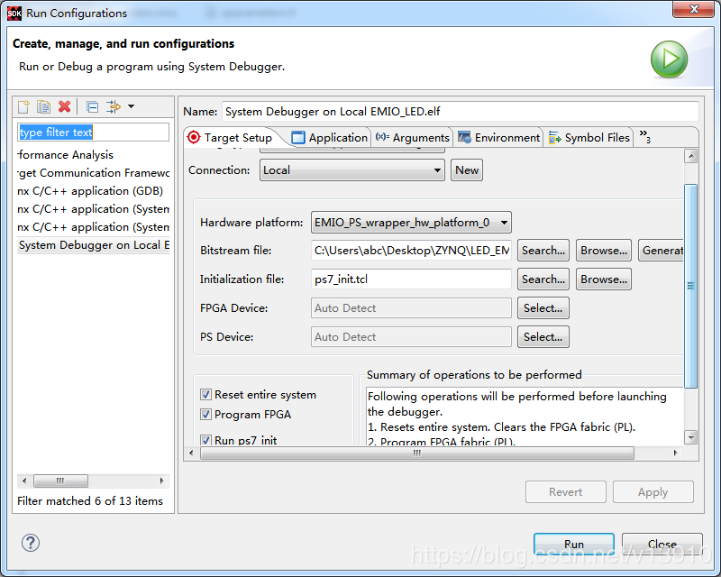 之后点灯就可以了。在运行之前先下载比特流文件到FPGA,另外这个黑金的小板子,PL和PS协同仿真时,总报错,只需要在Reset entire system和Program FPGA打上勾,并且这个比特流文件要绝对地址!!