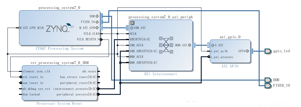 首先配置zynq ip核,PL部分保留,因为用到了AXI,另外MIO gpio都去掉。其余配置都一样。添加AXI gpio IP核,并且设置宽度为4,最后Run connection Automation,加入其它必要组件,调整连线: