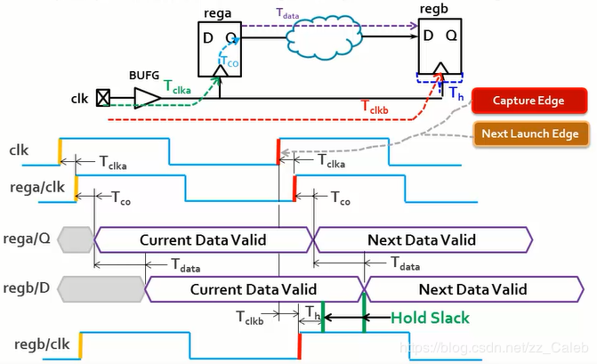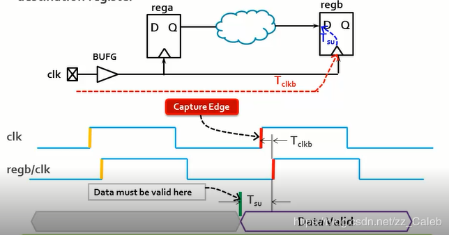 - 数据需要在时钟捕获沿到达之前的一段时间,必须到达。相当于是数据到达regb的时钟端口 和 regb的时钟处于capture edge这两个情况同时满足的时候,才可以进行接收数据。