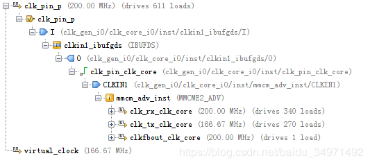 时钟clk_pin_p从输入引脚输入之后,经过IBUFDS,再通过MMCM生成时钟,同时显示了各个时钟的频率。如果我们未添加时钟约束,报告将显示Unconstrained(未约束的时钟,root clock).可以选中未约束的时钟右击选择Create Clock创建时钟。