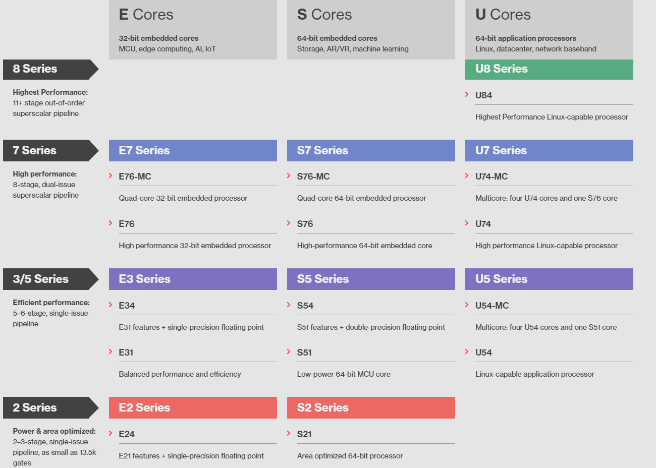 除了2、3和5系列的单发射处理器核心外,SiFive同样推出了7系列的双发射处理器以及去年10月公布的8系列超标量处理器。这其中又分为用于MCU、边缘计算、IoT的E系列32位处理器,用于存储、AR/VR、机器学习的S系列,以及用于数据中心、网络基带的U系列。