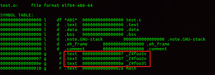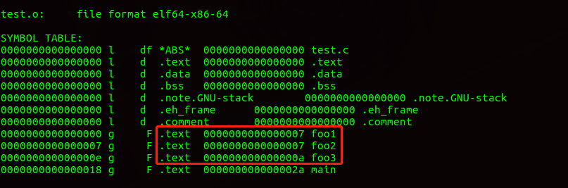编译这两个文件,生成test.o文件,通过objdump查看函数符号;