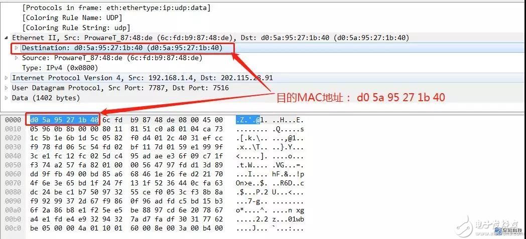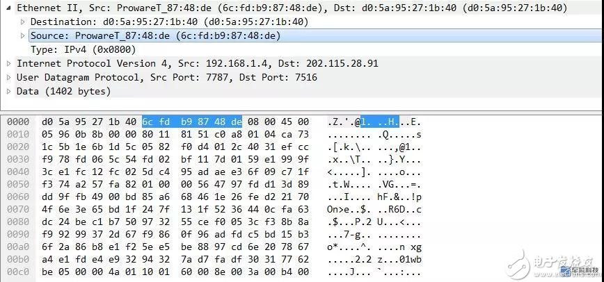 这样看,是不是就可以知道这个UDP包的前6个字节,就是目的MAC地址了呢?再来看接着的6个字节数据:6c fd b9 87 48 de