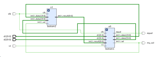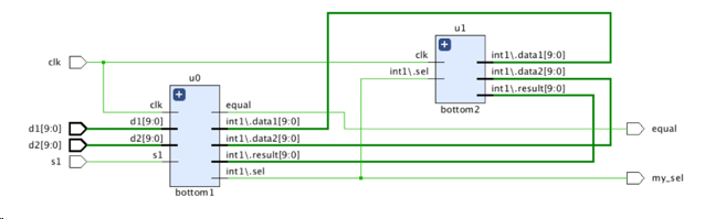 上面的 RTL 会对“bottom2”模块进行实例化,给它指定一个实例名称“u1”。 在“bottom2”模块中声明的接口“int1”现在与已在上一层声明的接口“int3”相关联。 进行这些更改后,设计的原理图如下所示: