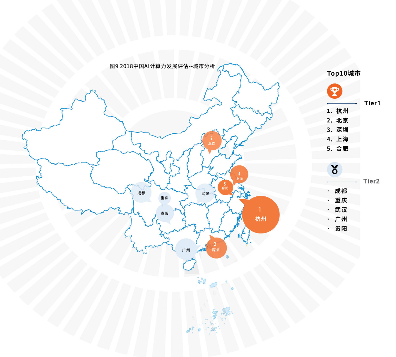 名单有趣的地方在于,互联网公司最聚集的城市——北京仅排第二,计算力不如杭州;合肥这座二线城市也脱颖而出,成为中国最领先的人工智能计算力城市之一。