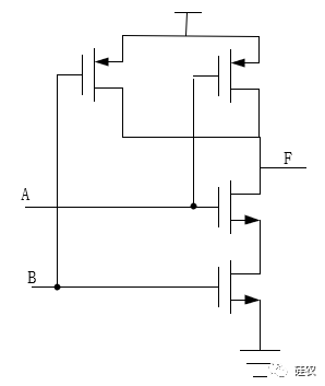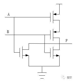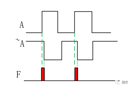 下面这个电路,使用了两个逻辑门,一个非门和一个与门,本来在理想情况下F的输出应该是一直稳定的0输出,但是实际上每个门电路从输入到输出是一定会有时间延迟的,这个时间通常叫做电路的开关延迟。而且制作工艺、门的种类甚至制造时微小的工艺偏差,都会引起这个开关延迟时间的变化。
