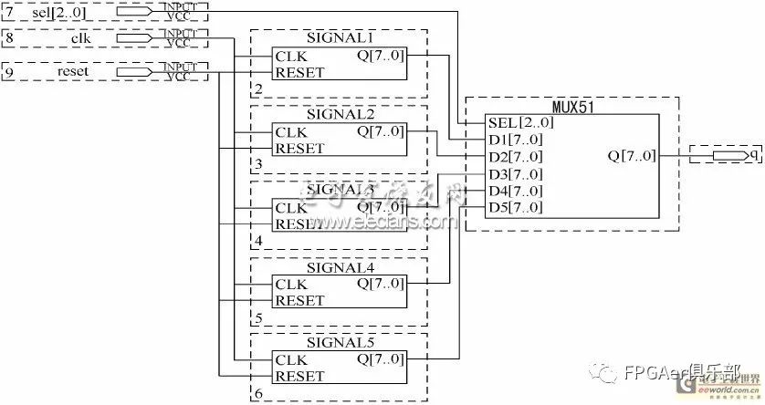 将上述6 个模块生成符号,供顶层电路调用。这些模块分别是:递减锯齿波信号产生模块signall、递增锯齿波信号产生模块signal2、三角波信号产生模块signal3、阶梯波信号产生模块signal4、方波信号产生模块signal5 和数据选择器mux51。顶层电路的连接如图5 所示。