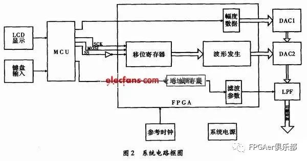 励磁信号发生器电路系统主要由基于FPGA的DDS电路、MCU控制电路、DAC电路、低通滤波器(LPF)、人机接口、系统时钟和系统电源构成。系统框图,如图2所示。