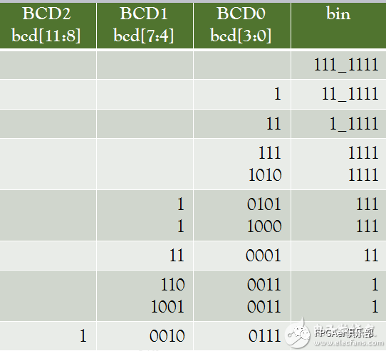 bin_data[11:0]:输出的BCD码(输入的二进制数据为8位,最大 为8’b1111_1111(255),每四位二进制表示一个BCD码,故而12位)。