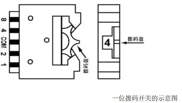 如果PLC控制系统中的某些数据需要经常修改,可使用多位拨码开关与PLC连接,在PLC外部进行数据设定。如下图所示为一位拨码开关的示意图,一位拨码开关能输入一位十进制数的0~9,或一位十六进制数的0~F。