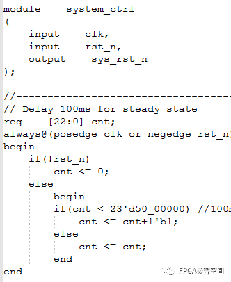 第一个进程用来延时,当上电后,延时100ms,以保证FPGA内部达到稳定状态;此时sys_rst_n始终为0,也就是系统时钟处于复位状态中;2.当100ms延时结束后,sys_rst_n与系统时钟同步释放,即sys_rst_n拉高,复位结束,系统开始正常工作。