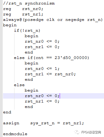 信号rst_n用来对进程中所用变量的初始化,这个复位信号是十分重要的,如果没有复位,会导致一些寄存器的初始值变得未知,如果此时FPGA就开始工作的话,极易导致错误。