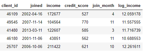 我们可以通过查找 joined 列的月份或对 income 列取自然对数来构造新特征。这些都属于“转换”操作,因为它们都只用了来自一张表的信息。