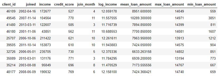 importpandasaspd#Grouploansbyclientidandcalculatemean,max,minofloansstats=loans.groupby('client_id')['loan_amount'].agg(['mean','max','min'])stats.columns=['mean_loan_amount','max_loan_amount','min_loan_amount']#Mergewiththeclientsdataframestats=clients.merge(stats,left_on='client_id',right_index=True,how='left')stats.head(10)