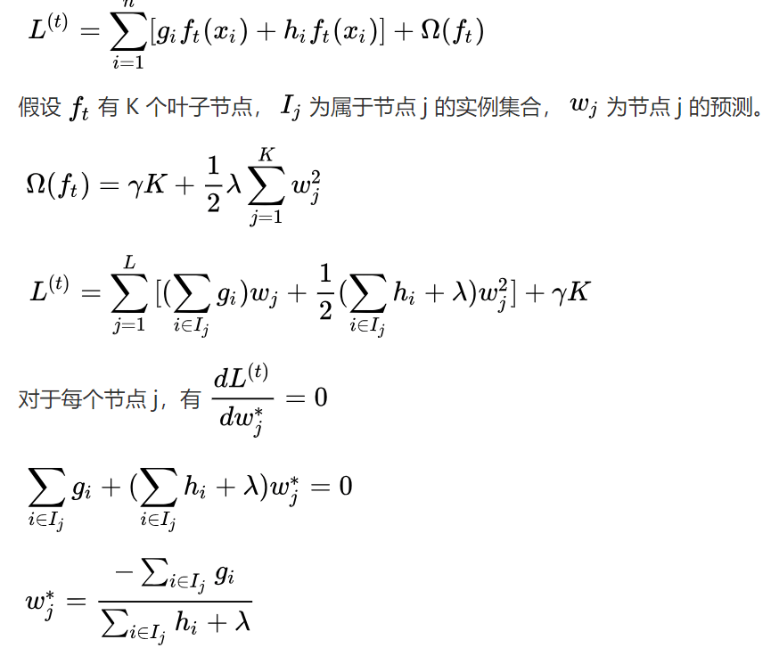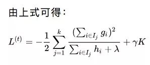 假设韩梅梅更新了一个具有K个叶子节点的基学习器ft。设Ij是属于节点j的实例集合,wj是该节点的预测。因此,对于Ij中的实例i,我们有ft(xi)=wj。所以我们在上式中用代入法更新了L(t)的表达式。更新后,我们就能针对每个叶子节点的权重采用损失函数的导数,以获得最优权重。
