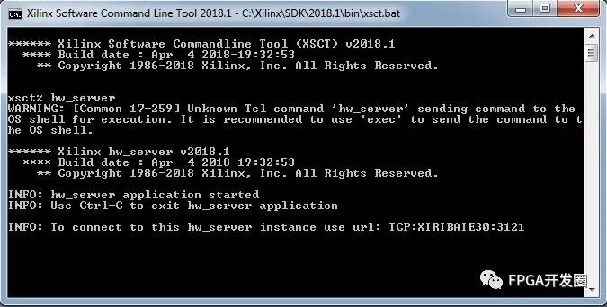 硬件服务器在通过JTAG连接目标的远程主机中,从XSCT控制台启动Xilinx hw_server。