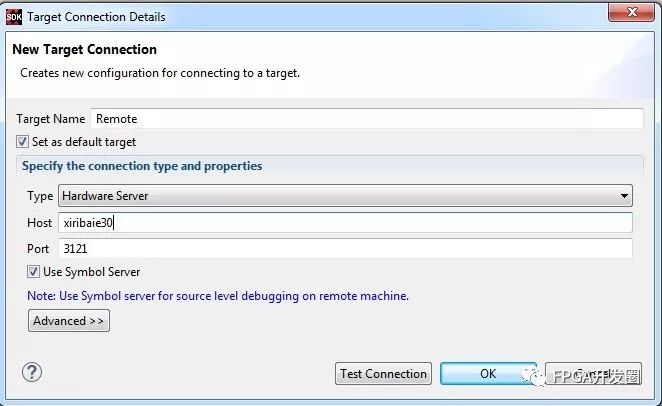 SDK目标连接在硬件服务器中添加新的目标配置。