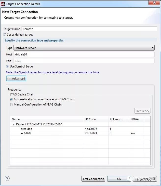 高级选项卡可用于检查远程JTAG链中的可用设备。