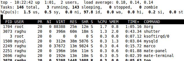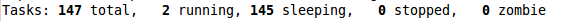 第二行显示的是任务或者进程的总结。进程可以处于不同的状态。这里显示了全部进程的数量。除此之外,还有正在运行、睡眠、停止、僵尸进程的数量(僵尸是一种进程的状态)。这些进程概括信息可以用’t’切换显示。