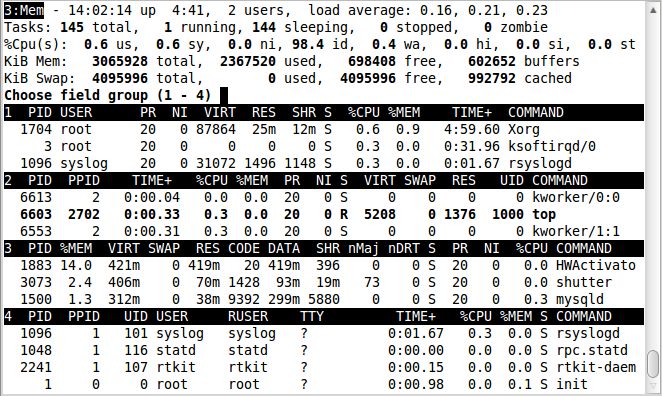 这个命令在全屏和交替模式间切换。在交替模式下会显示4个窗口(译注:分别关注不同的字段):