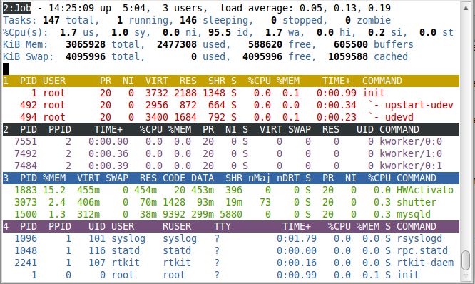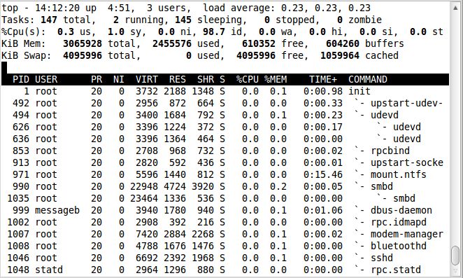 前几行水平显示了不同系统参数的概括,接下来是进程和它们在列中的属性。