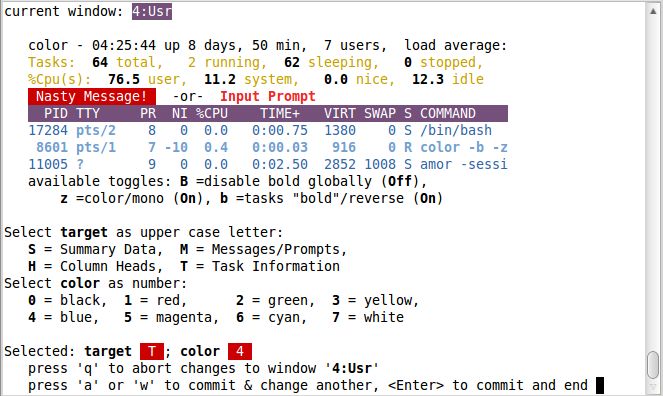 按下’Z’向用户显示一个改变top命令的输出颜色的屏幕。可以为8个任务区域选择8种颜色。