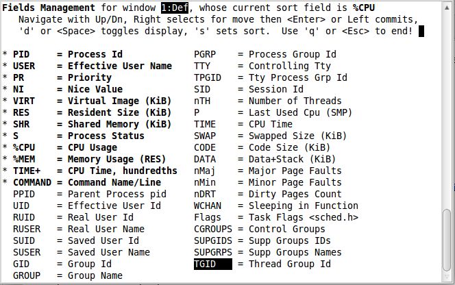 切换高亮信息:’x’将排序字段高亮显示(纵列);’y’将运行进程高亮显示(横行)。依赖于你的显示设置,你可能需要让输出彩色来看到这些高亮。