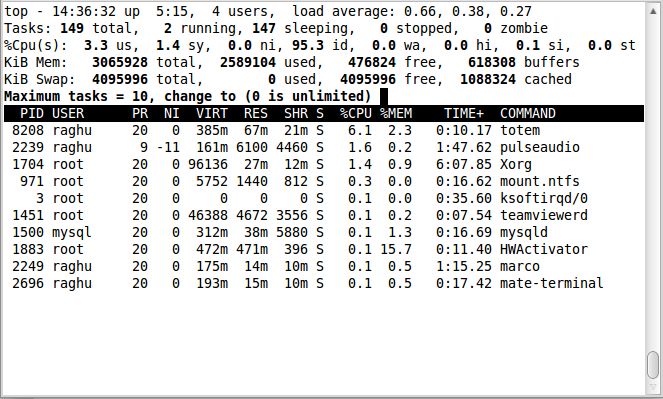 这些命令行选项与上面讨论的命令大多相同。top的输出可以用命令交互操作,但是你也可以带参数运行top来设置你想要的效果。